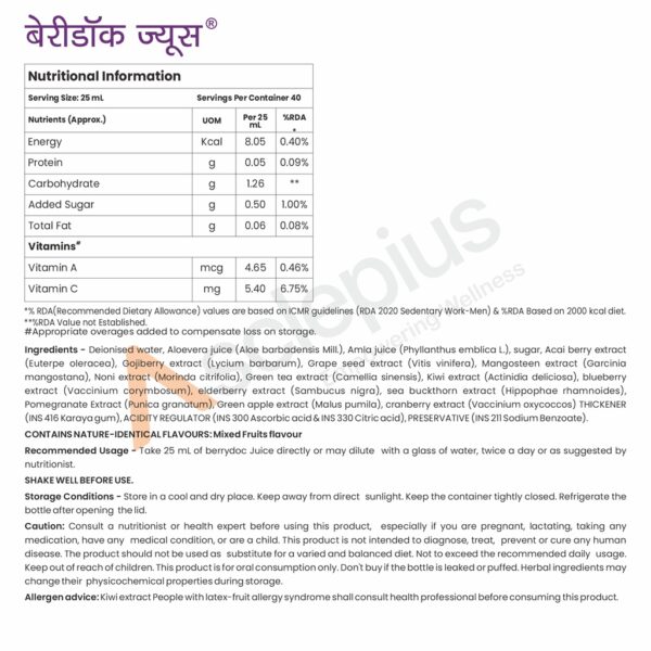 | How to Use: | Take 25 mL of berrydoc juice directly or may dilute with a glass of water, twice a day or as suggested by nutritionist. SHAKE WELL BEFORE USE. |