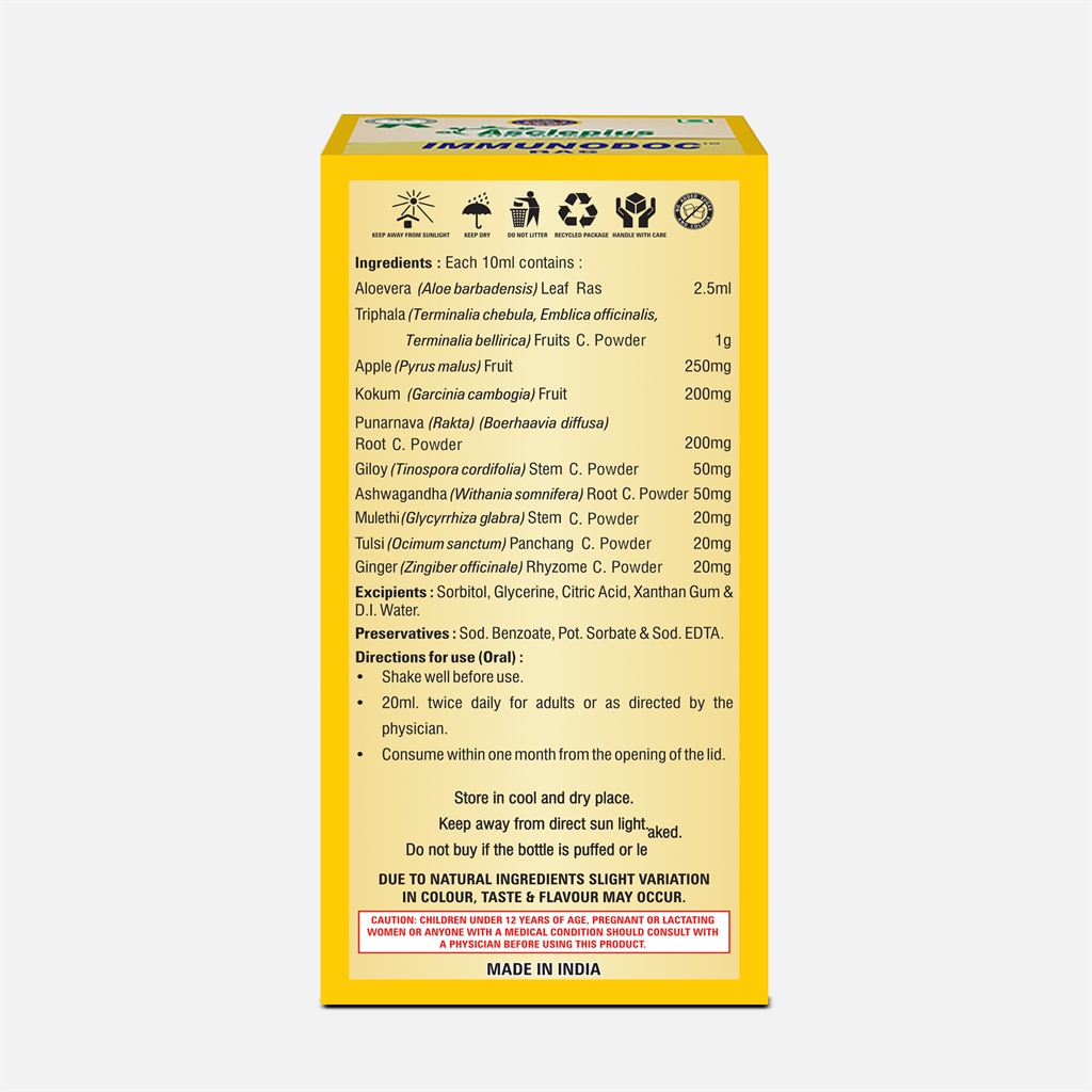 Each 10ml contains Aloevera (Aloe barbadensis) Leaf Ras 2.5ml Triphala (Terminalia chebula, Emblica officinalis, Terminalia bellirica) Fruits Ras 1g Apple (Pyrus malus) Fruit 250mg Kokum (Garcinia cambogia) Fruit Ext. 200mg Punarnava (Rakta) (Boerhaavia diffusa) Root C. Powder 200mg Giloy (Tinospora cordifolia) Stem C. Powder 50mg Ashwagandha (Withania somnifera) Root C. Powder 50mg Mulethi (Glycyrrhiza glabra) Stem C. Powder 20mg Tulsi (Ocimum sanctum) Panchang C. Powder 20mg Ginger (Zingiber officinale) Rhizome C. Powder 20mg Excipients: Sorbitol, Glycerin, Citric Acid, Xanthan Gum & D.I. Water. Preservatives: Sod. Benzoate, Pot. Sorbate & Sod. EDTA.
