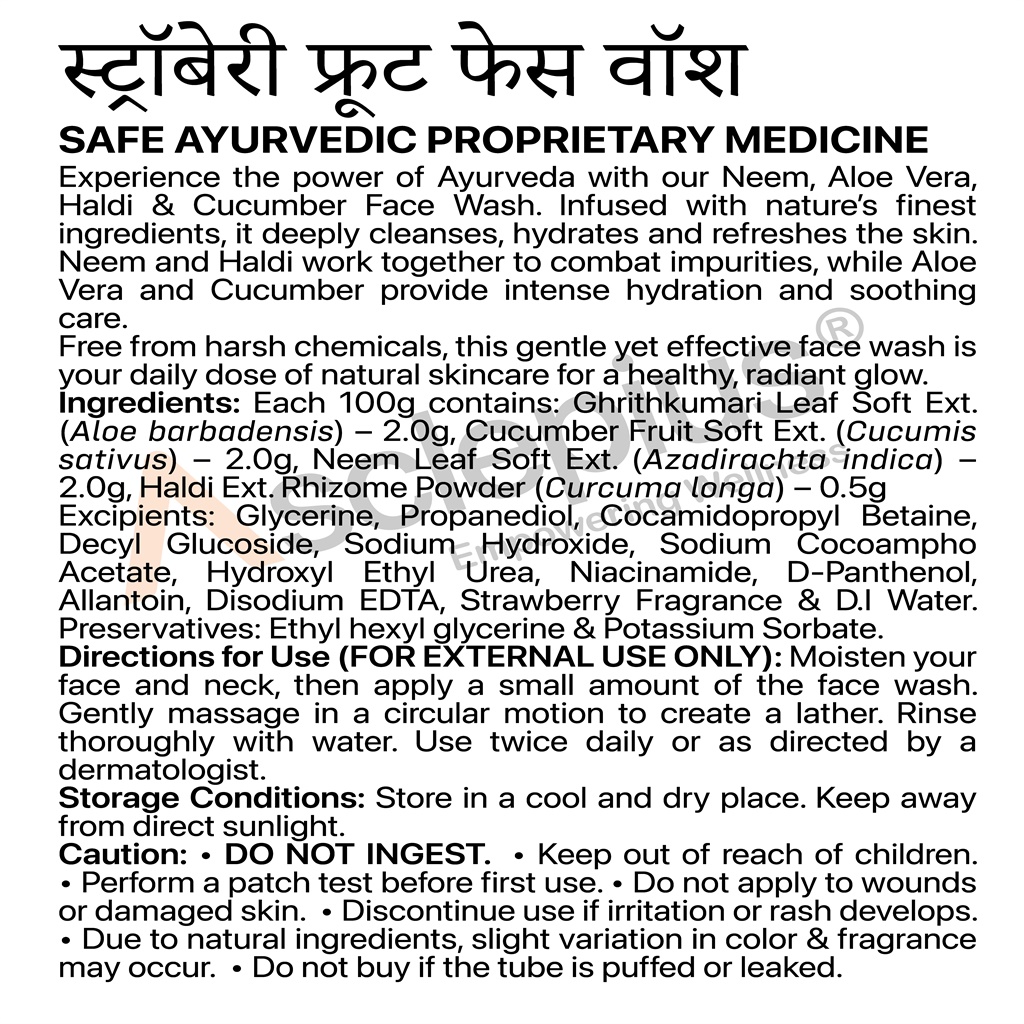 | Benefits: | • Cleanses dirt, oil, and impurities while keeping skin fresh • Enriched with Strawberry Extracts for glow and a fruity freshness • Neem and Haldi purify and protect the skin from acne and blemishes • Aloe Vera and Cucumber hydrate and soothe the skin • Leaves skin soft, smooth, and radiant • Herbal, chemical-free formulation suitable for daily use. |